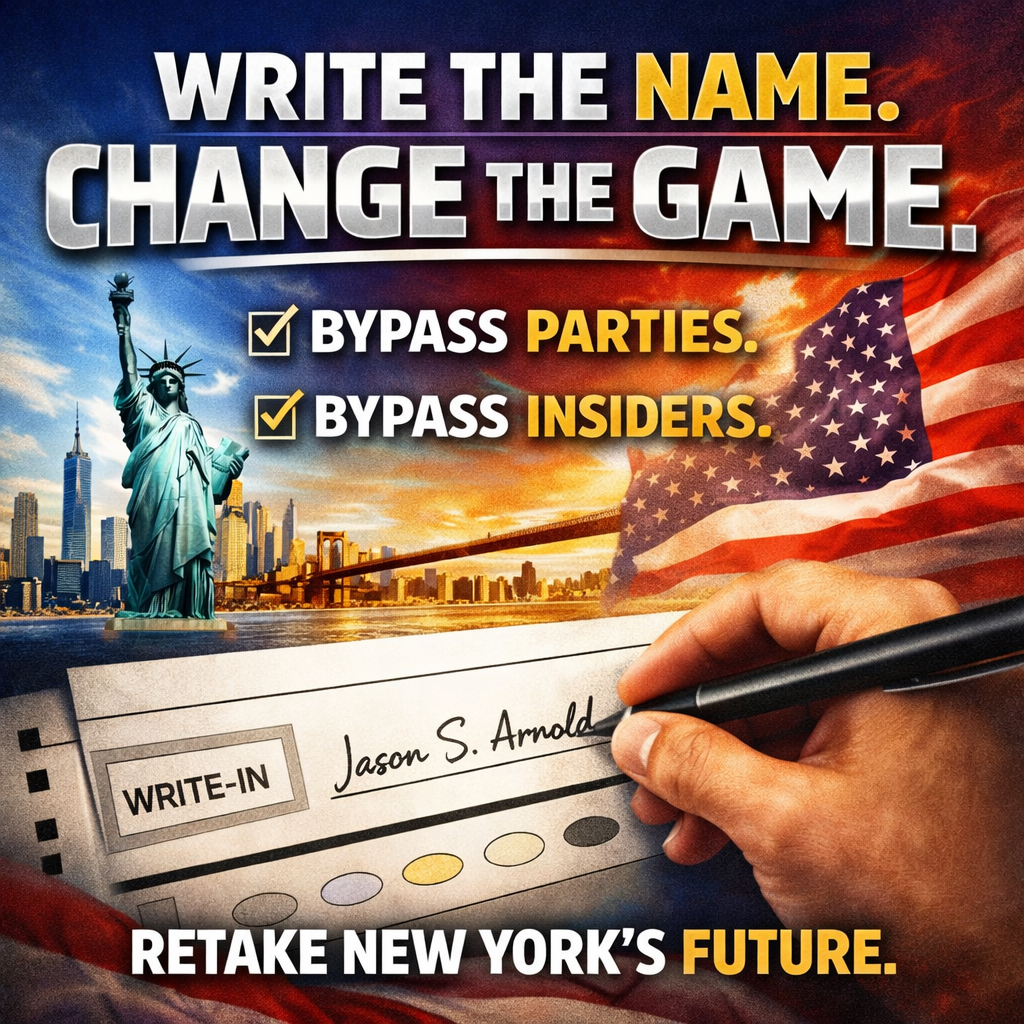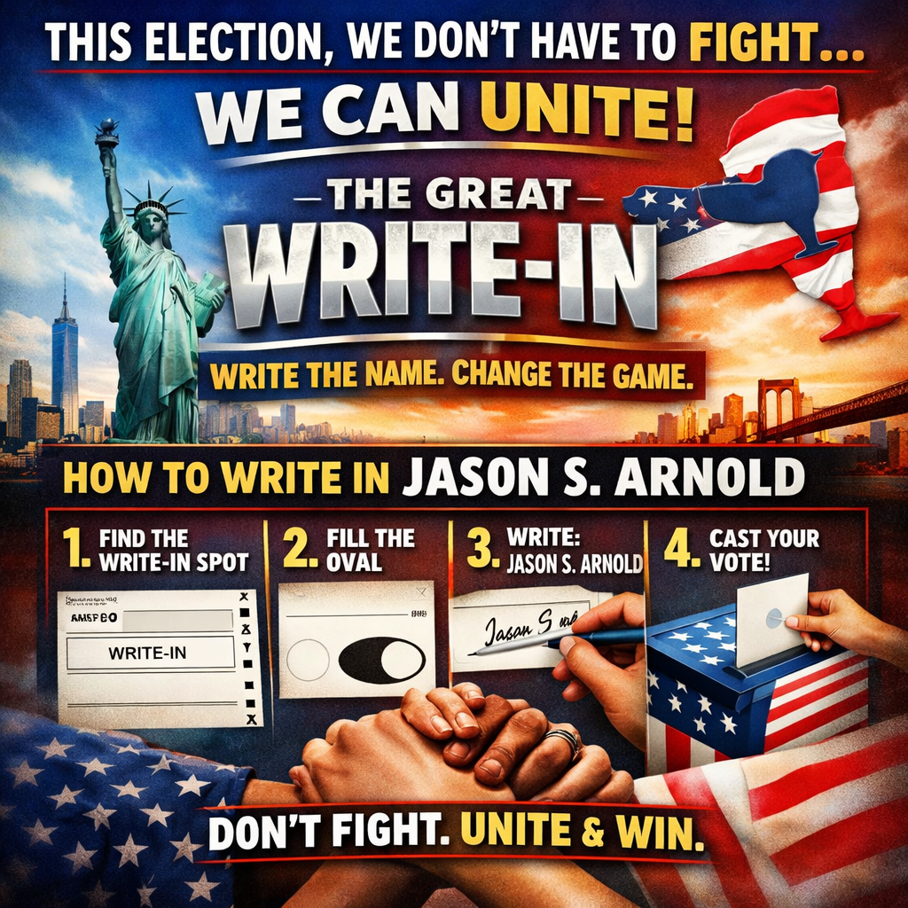 #ThisIsOurElectionNEW YORK — THIS ELECTION, YOU DON’T HAVE TO FIGHT… WE CAN UNITE. The Great Write-In isn’t about parties. It’s about people remembering they still have the power. If the system won’t give us the candidate we believe in, the Constitution gives us another option — we write the name in ourselves. 🗳 WHAT THE GREAT WRITE-IN IS: A peaceful, legal way for voters across New York to unite behind one candidate without needing party permission, insider backing, or political gatekeepers. 🖊 HOW TO DO IT: 1.Go to vote like normal on Election Day 2.Find the write-in line on the ballot 3.Fill in the oval/box 4.Write in: Jason S. Arnold 5.Submit your ballot — that’s it No protests. No chaos. No division. Just voters using the system the way it was meant to work. This isn’t about left vs right. It’s about New Yorkers standing together and proving the people still decide the future of this state. If enough of us act together, we don’t need to fight. We can unite — and win. New York gubernatorial race, 2026. I’m not a good candidate, I’m the right one. #SpreadTheWord #ShareThisNY #GrassrootsMovement #TakeBackOurVote #ThisIsOurElection0 Commenti 0 condivisioni 54 Views 0 Anteprima